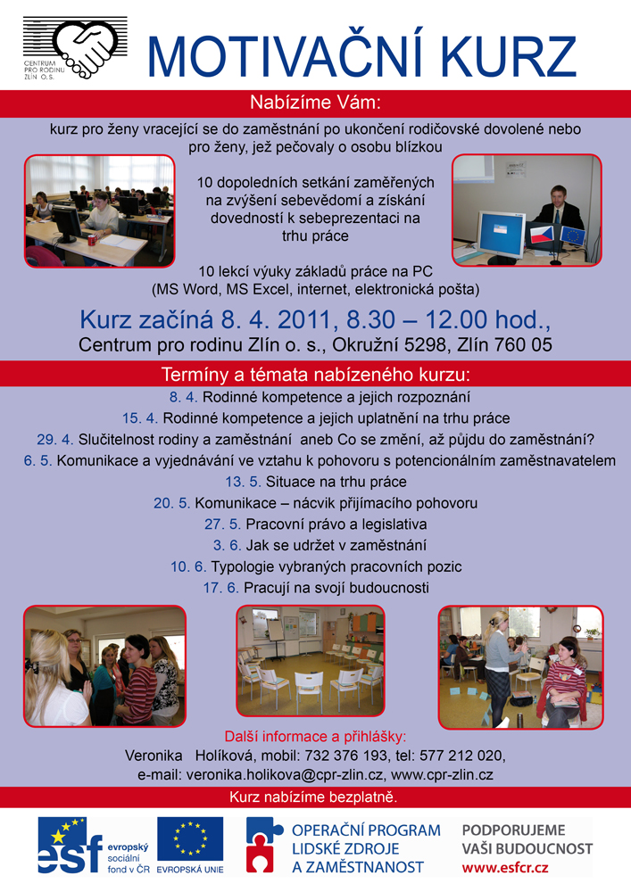 Zahájení motivačního kurzu pro ženy, které ukončily nebo v blízké budoucnosti ukončí rodičovskou dovolenou a čeká je hledání zaměstnání nebo pro ženy, jež pečovaly o osobu blízkou a též je čeká návrat do profesního života, se uskuteční dne 8. dubna. Kurz se bude konat 2x týdně po dobu deseti týdnů. Ve středu dopoledne bude probíhat výuka základů práce na PC a v pátek dopoledne teoretická, nácviková část. Je to poslední kurz tohoto typu, který se bude otevírat v blízké době. V měsíci srpnu končí projekt, v rámci kterého se kurz organizuje. Podrobné informace najdete zde: Informace_Motivacni kurz.doc (311,5 kB) a leták kurzu: MK_Letak.jpg (582,8 kB)